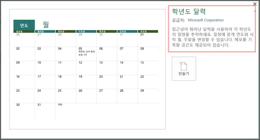 만들기 버튼을 선택하여 달력 탬플릿을 다운 받으면 해야 할 내용은 거의 다 끝났습니다.