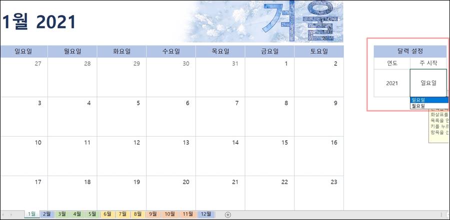 위의 모습은 달력이 실행된 모습입니다. 1월을 선택하니 겨울 디자인과 함께 해당 연도의 달력이 선택되었습니다.