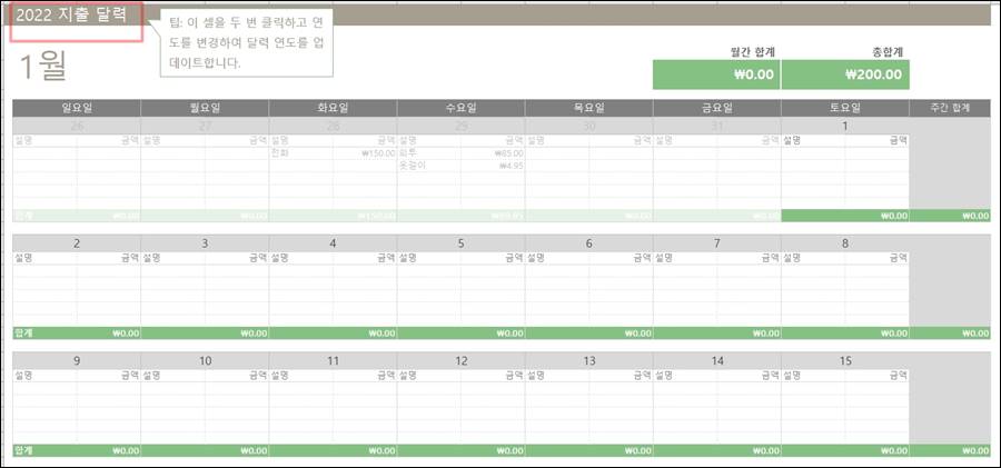 마지막으로 살펴볼 달력은 가계부로 사용가능한 지출 달력입니다.