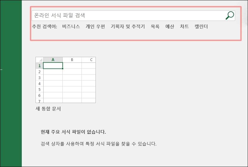 엑셀을 실행한 후 새로 만들기를 실행하면 위와 같이 일반적으로 새 통합 문서를 선택하지만 그 위에 보면 온라인 서식 파일을 검색할 수 있도록 만들어 놓았습니다.