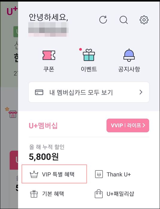 유플러스 멤버십 어플이 있다면 위와 같이 우측 상단의 메뉴 버튼을 선택해주세요. 그러고 나서 아랫부분에 있는 VIP 특별 혜택 메뉴를 선택해주면 됩니다.