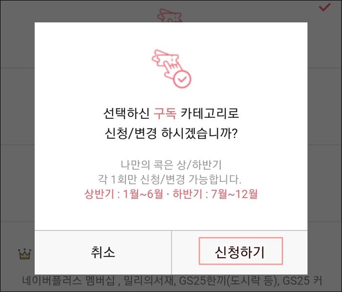 구독콕을 신청하기 위해서는 아래에 있는 신청/변경하기 메뉴를 선택해주면 되는데, 오른쪽과 같이 나오는 화면에서 구독을 선택한 후 선택 완료를 해주면 간단하게 구독콕으로 변경이 완료됩니다.