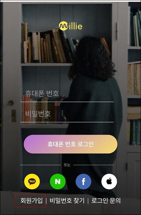 위와 같은 화면이 나왔다면 화면 아랫부분에 있는 회원가입을 눌러 신청을 진행해주면 됩니다. 기존에 밀리의 서재 회원이신 분은 바로 로그인을 진행하면 되겠습니다.