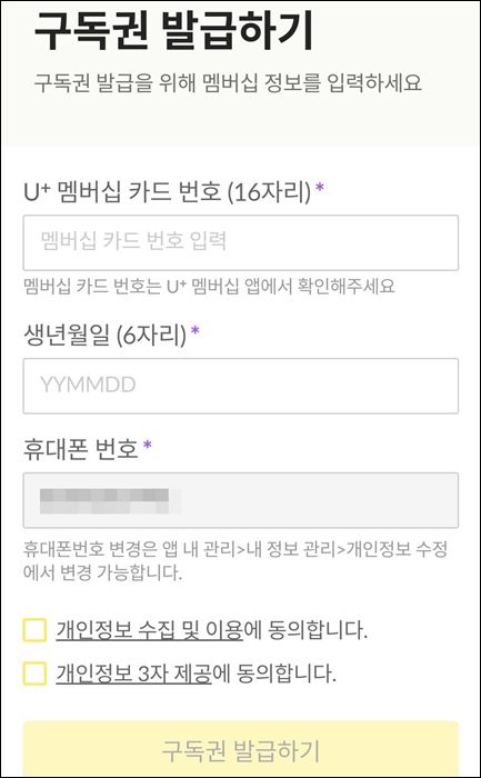 그리고 이제 중요한 구독권 발급을 위해 U+ 멤버십 카드 번호 16자리를 입력해주세요.