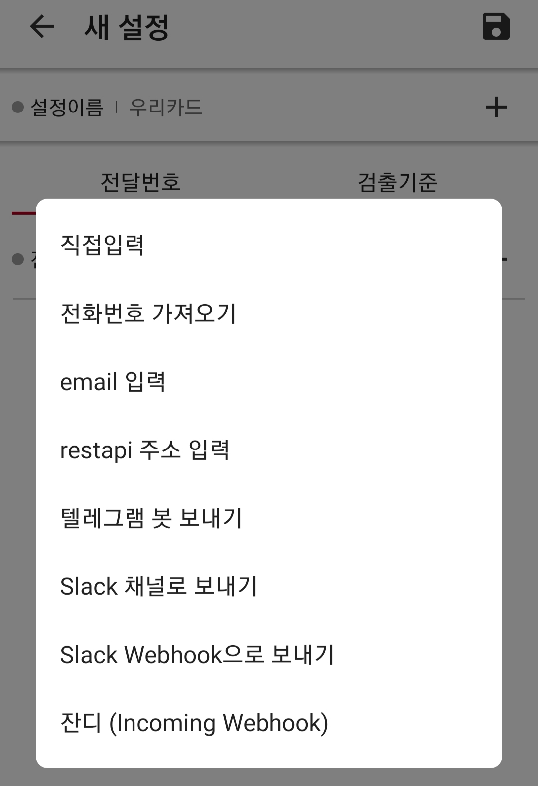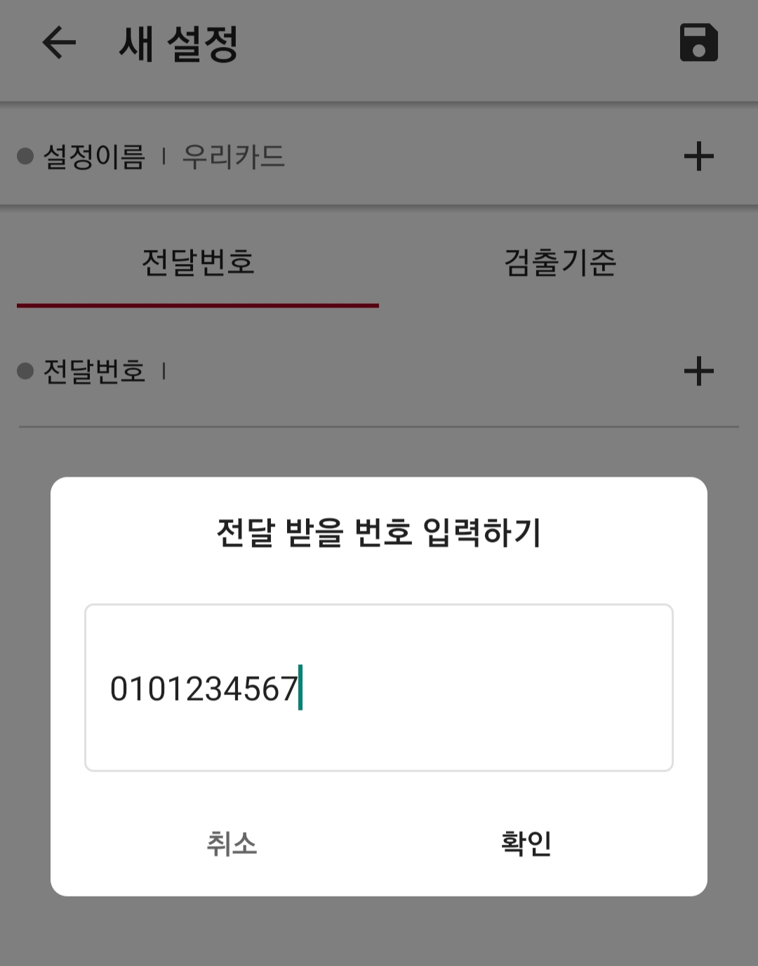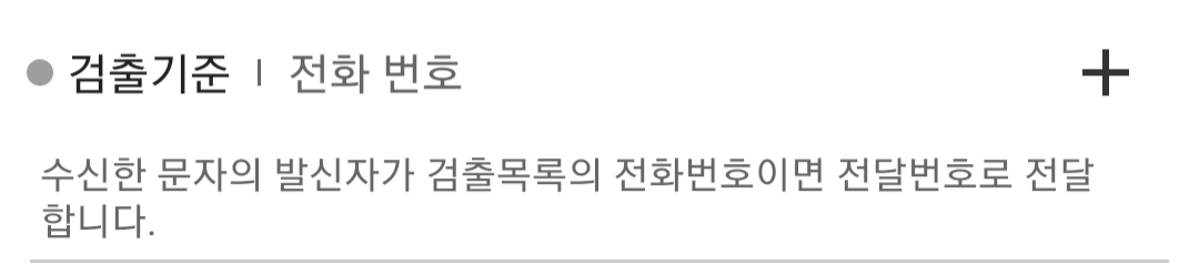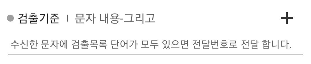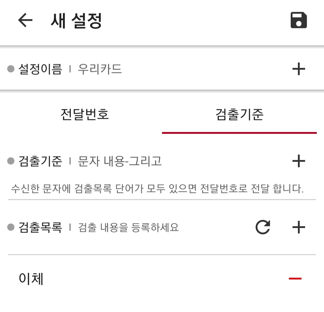 "+" 버튼을 눌러 새 설정 메뉴로 들어갑니다. 이 화면에서 설정할 이름과 전달할 전화번호, 전달할 내용의 검출 기준을 설정해 줍니다.