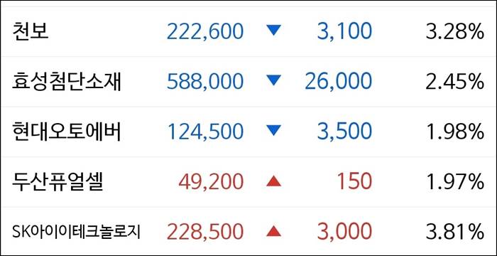 마지막으로 배터리 관련 업체인 두산 퓨어셀과 효성첨단소재, 천보, SK아이이테크놀로지도 빠지지 않고 포함되어 있네요.