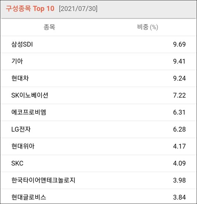 이름에서 알수있듯이 자동차 관련, 친환경 관련 종목들을 메인으로 주축을 이루고 있는것이 특징이 되겠습니다.
