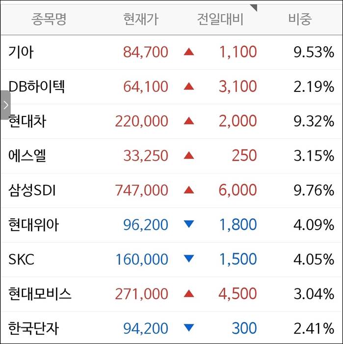 자동차 테마로 분류되는 DB하이텍과 에스엘이 포함되어 있고 현대 위아와 SKC도 4%의 비중으로 주요 업체로 자리잡고 있습니다.