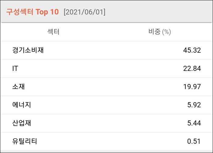 이 ETF가 투자하고 있는 섹터를 살펴보면 이름에 걸맞게 경기소비재 즉, 자동차 종목 분야와 IT, 그리고 소재(배터리 등) 종목을 주 종목으로 볼 수 있겠습니다.