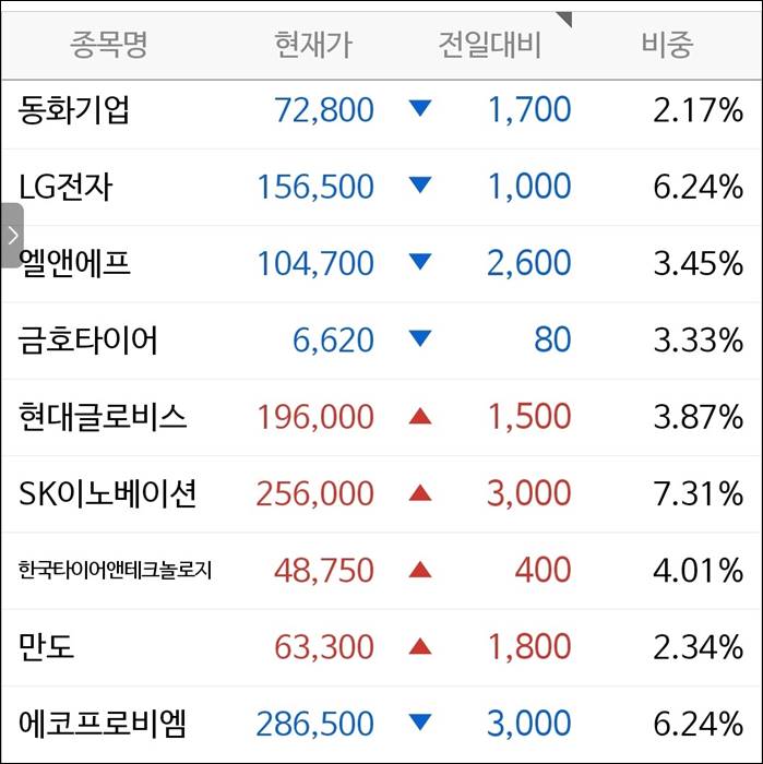 그외에는 전자업체로는 LG 전자와 타이어 업체로는 한국타이어가 비중있게 들어가 있습니다.
