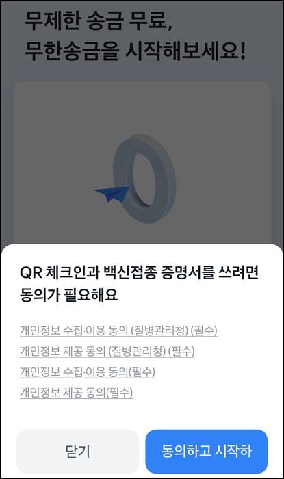 토스 앱을 사용하고 계신다면 위와 같이 QR코드 생성을 위한 팝업 화면을 보시게 될 겁니다. 그럼 위와 같이 동의를 하고 시작하기를 진행하면 됩니다.