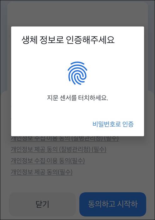 지문 인증을 통해서 인증을 진행할 수 있습니다. 지문이 따로 등록되어있지 않다면 비밀번호 인증으로도 진행을 할 수가 있습니다.