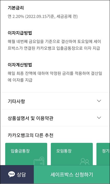 이제 위와 같이 세이프 박스 상품 설명서를 확인을 하신 다음에 출금 계좌 연동만 해주시면 세이프 박스 개설은 완료가 되겠습니다.