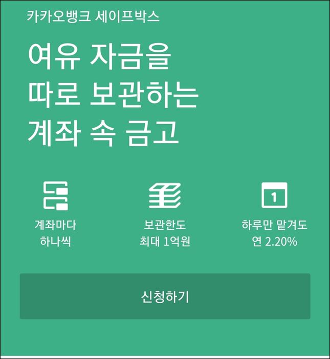 왼쪽의 화면에 있는 점 세 개 메뉴로 들어가 보면 여러 메뉴 중에 세이프 박스라고 있습니다. 이 메뉴로 접속하시면 오른쪽과 같은 카카오 뱅크 세이프박스라는 신청 화면을 보실 수가 있겠습니다