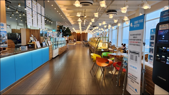 바로 앞에는 통유리로 바다가 바로 펼쳐져 있고, 그 창가를 따라서 자리들이 빼곡하게 위치해 있답니다.
