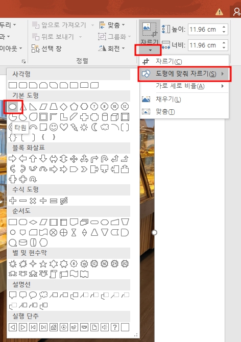 자르기라고 된 부분의 아래쪽 화살표를 눌러보면 도형에 맞춰 자르기라고 메뉴가 있습니다.