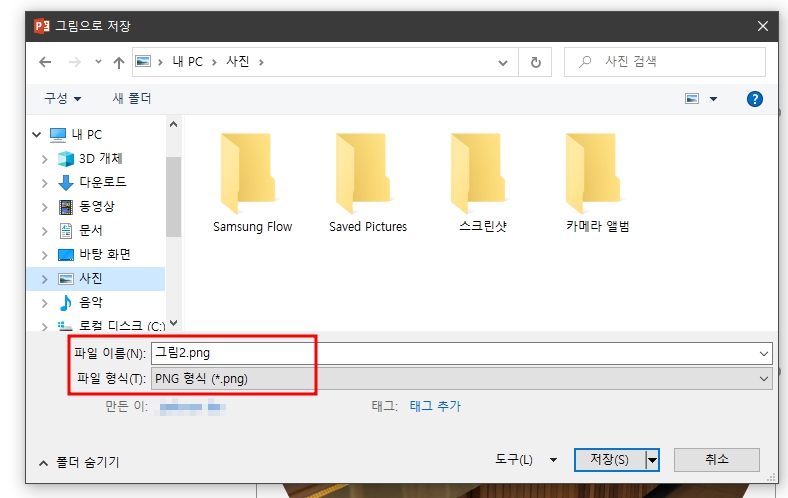 파일 형식을 아래 사진과 같이 PNG로 해주면 로고등을 만들 때처럼 배경은 없는 순수한 원형의 사진을 만들 수 있습니다.