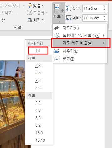 그럼 타원형이 아닌 완벽하게 둥근 원 모양으로 하고 싶다면 위와 같이 도형에 맞춰 자르기 아래쪽에 있는 가로 세로 비율 메뉴를 눌러서 1:1로 사진을 미리 잘라주세요.