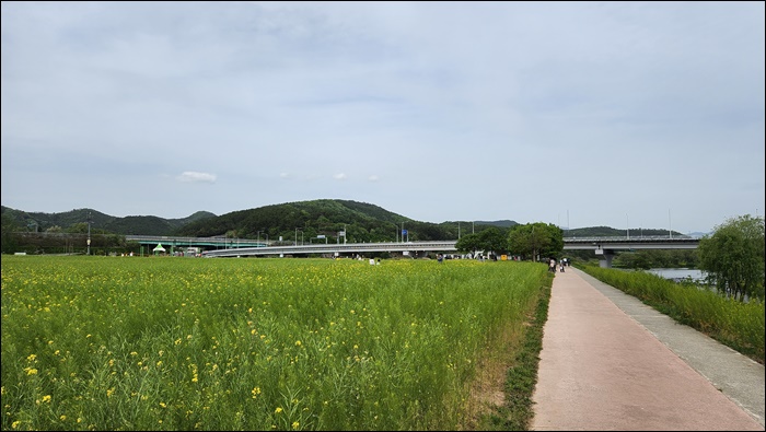 저 멀리 노곡교가 보이고 아주 넓게 유채꽃단지가 펼쳐진 것을 볼 수가 있어요.