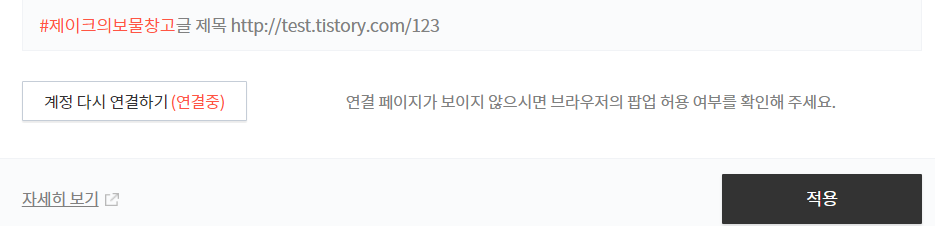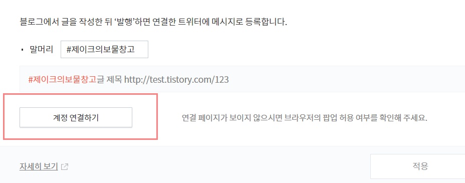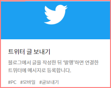기본적으로 티스토리에서는 본인의 트위터 계정과 연동하여 티스토리 포스팅을 하면 자동으로 그 포스팅이 트위터로 전송되도록 하는 기능을 알려주고 있습니다.
