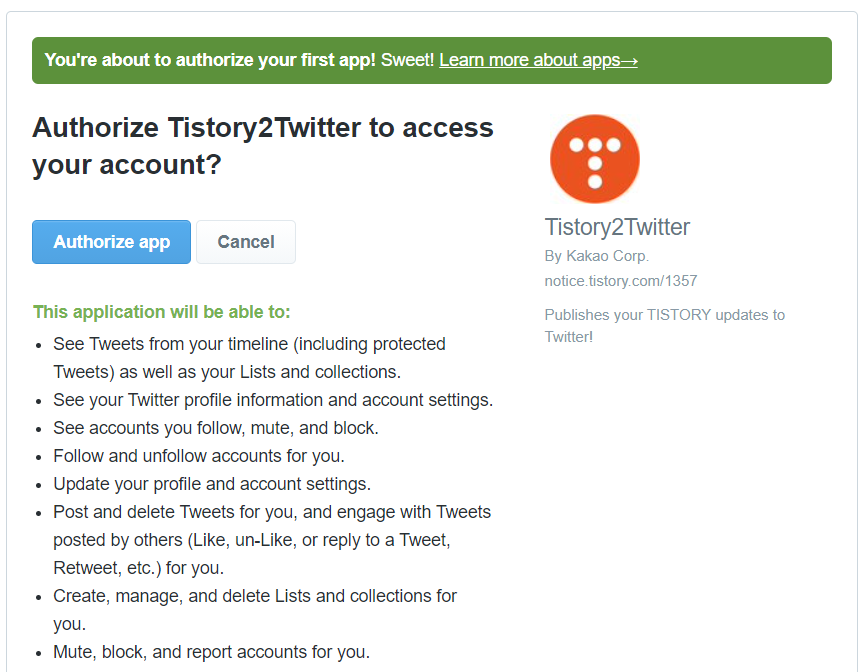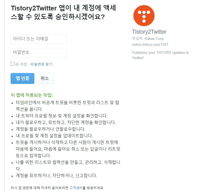 로그인까지 완료 후 앱 인증을 눌렀다면 아래와 같이 티스토리에서 트위터로 접근을 승인하시겠습니까?라고 물어봅니다.