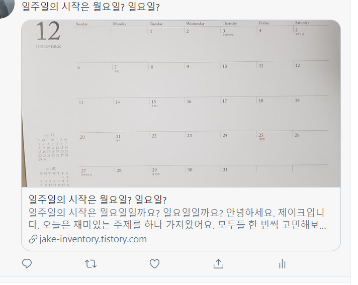 | 일주일의 시작은 월요일? 일요일? (14) | 2020.12.01 |