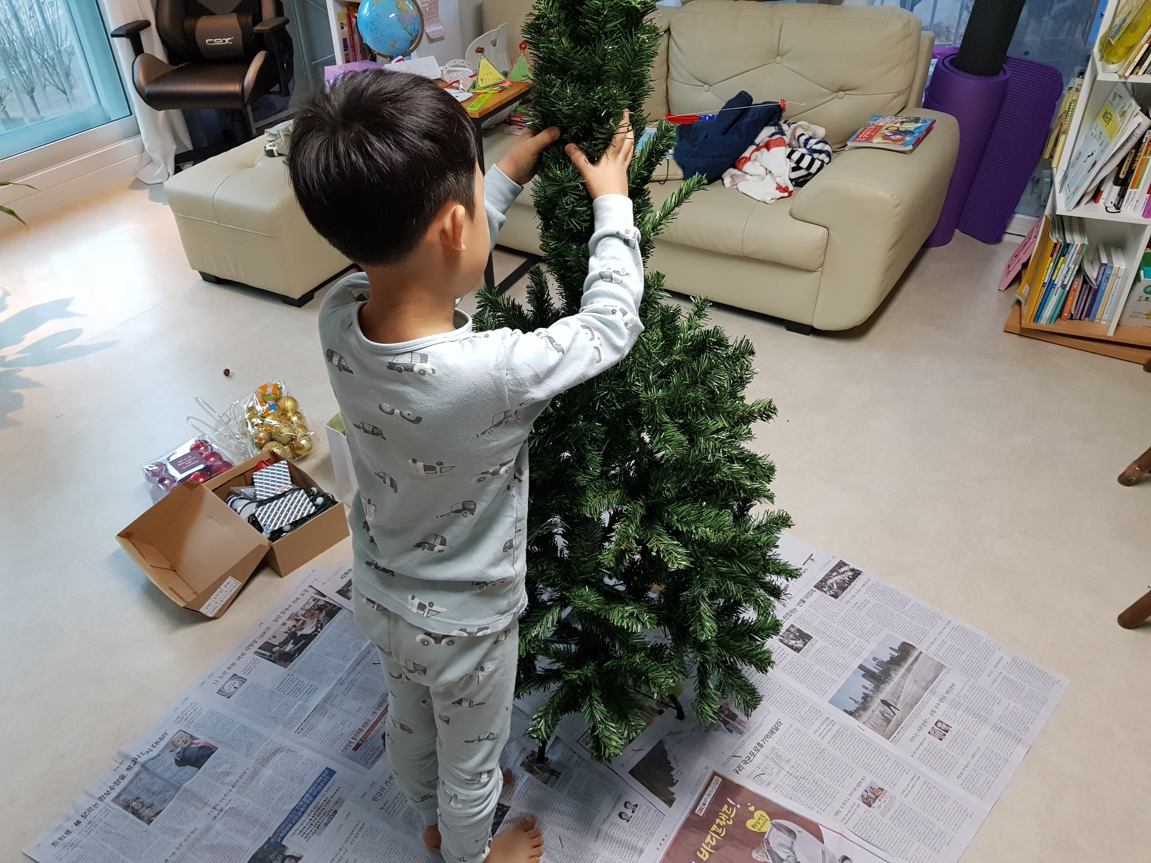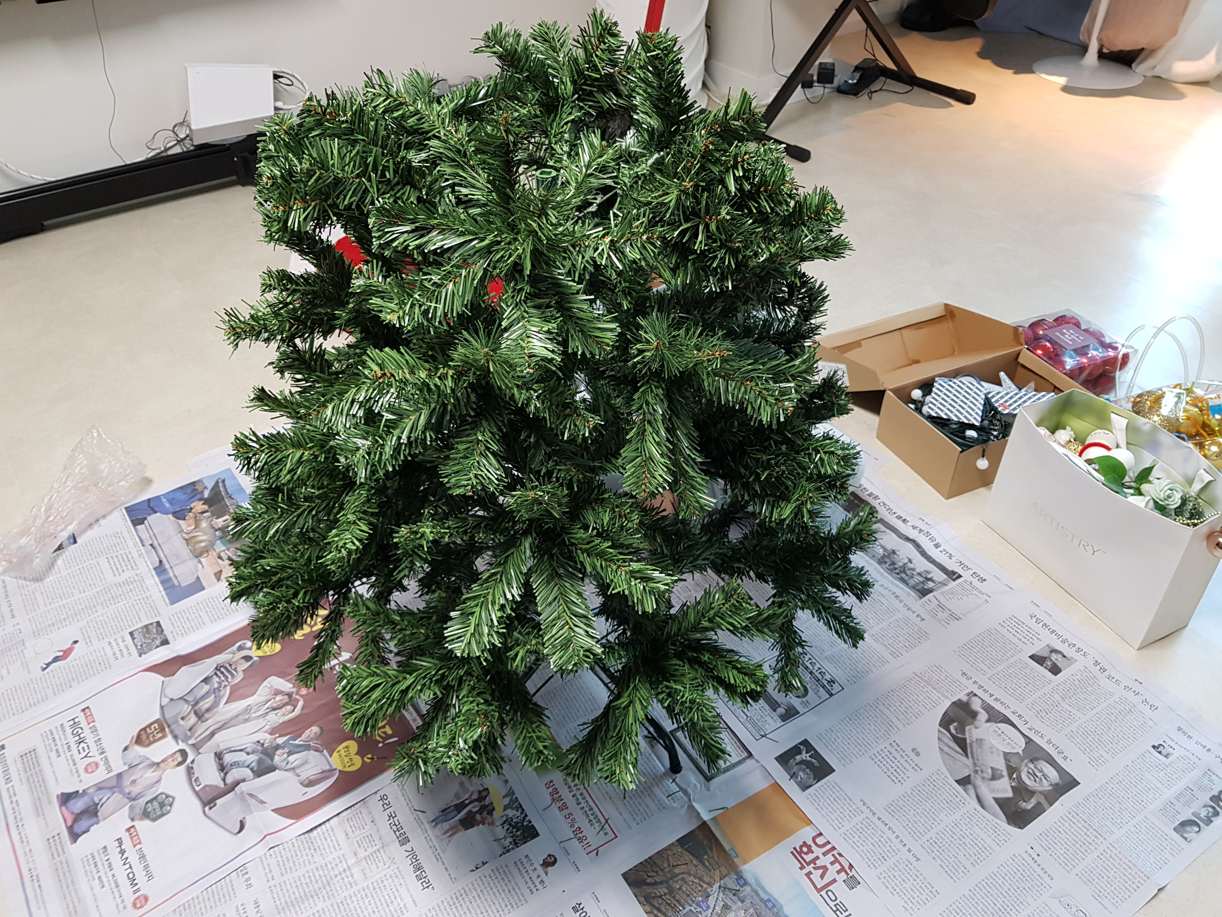 아! 트리 나뭇잎들이 한 올 한올 잘 떨어질 수 있으니, 트리를 꾸밀 때 바닥에 신문지를 꼭 깔아주세요.