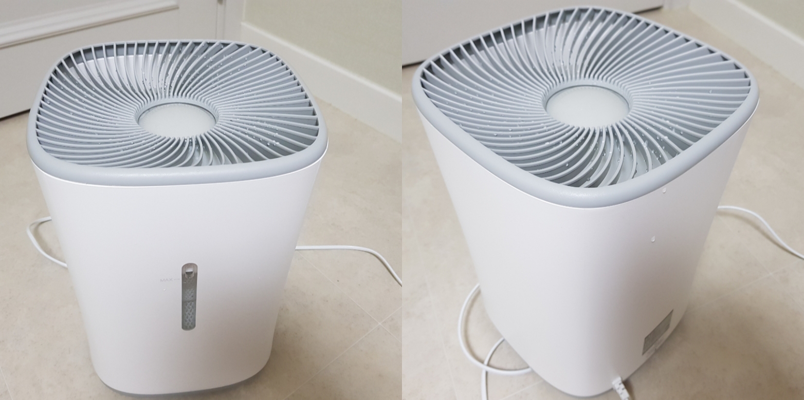 여기서 한 가지 중요한 점은 물 보충시에 가습기 측면에 수위 창에서 MAX라고 되어 있는 부분을 넘지 않도록 해야 합니다. MAX 이상으로 물을 넣게 되면 MAX 윗부분으로 물이 배출이 되긴 하는데, 가습기 내부 송풍기 보호를 위해 이 부분은 조심이 필요해 보입니다.