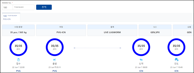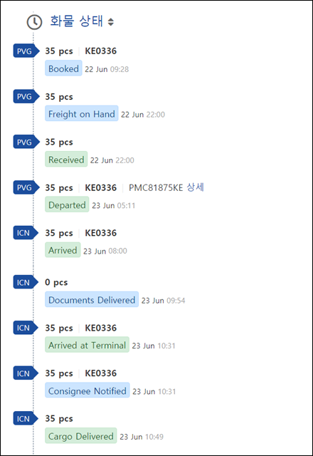 위와 같이 전체적인 선적 물품에 대한 정보 및 무게 출발 공항/도착 공항 등을 알려주며, 진행된 사항 및 현재 진행되고 있는 사항을 이미지로 쉽게 표시해 줍니다.