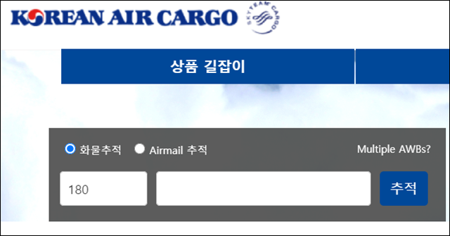 기본적으로 위와 같이 대한항공의 AWB 시작 번호인 "180"이 기본적으로 입력되어 있으며, 뒷부분에 AWB에 적힌 숫자 8자리를 입력해서 검색해주면 되겠습니다.