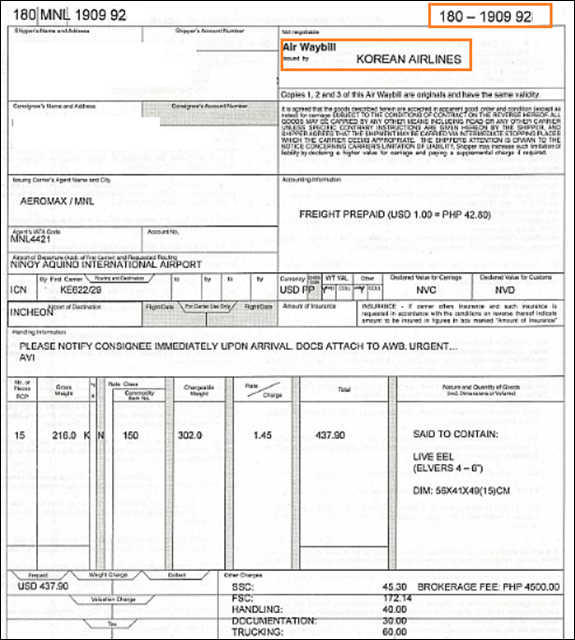 대한항공의 AWB는 180- 0000 0000으로 표현됩니다.