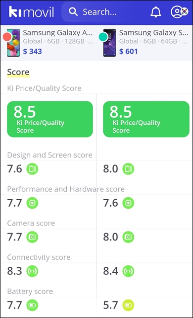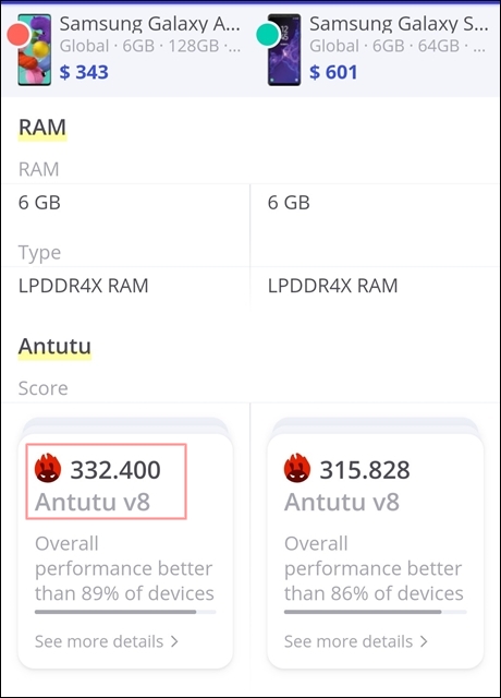동일하게 RAM이 적용되어 있으니, 중요한 것은 CPU와 그래픽 코어의 성능인데, 벤치마크 성적으로만 보면 A51이 S9+에 밀릴 이유는 없어 보이네요.