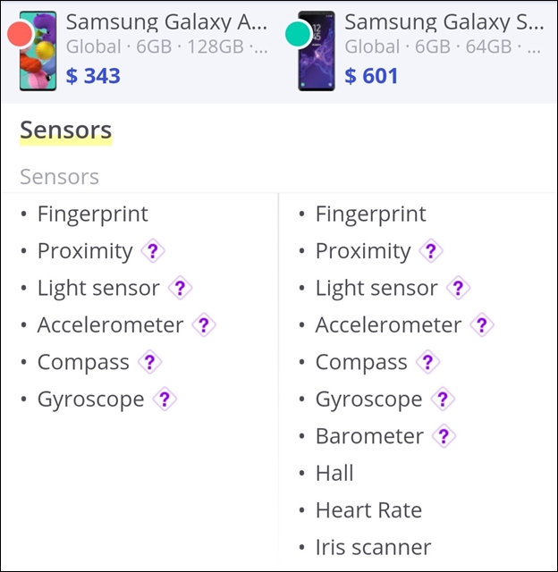 스마트폰에 적용된 센서를 보면 아래와 같이 갤럭시 A51에 필요한 센서는 대부분 적용된 것으로 보입니다. 그래도 갤럭시 S9+가 플래그쉽이다 보니 몇 가지의 센서들이 조금 더 장착되어 있는 것을 볼 수 있습니다. 심박수 측정 센서 등이 더 있는 것으로 보입니다.