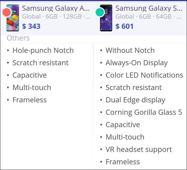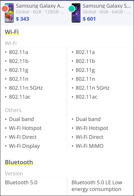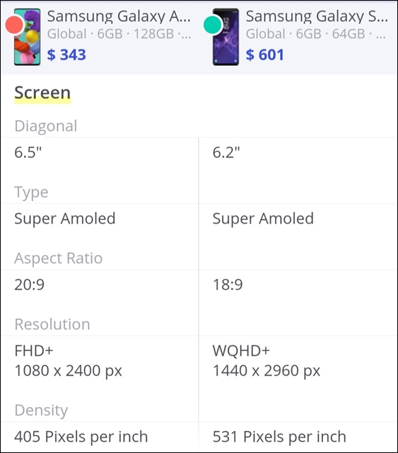 앞으로 설명드릴 표에서 왼쪽에 있는 제품이 갤럭시 A51이 되고, 오른쪽이 갤럭시 S9+가 되겠습니다.