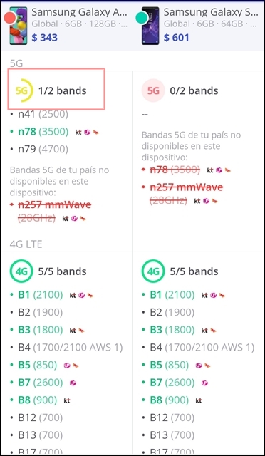갤럭시 A51 모델은 현재 판매되고 있는 제품이 5G 지원 제품으로 보입니다. 그래서 아래와 같이 5G를 지원하는 것으로 나오죠.