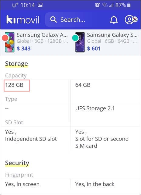 기본적으로 제공해주는 메모리는 삼성 갤럭시 A51이 128GB로 갤럭시 S9+ 대비 2배 많네요. 용량 걱정은 하지 않아도 될 수준입니다. 최근 출시되는 플래그쉽 스마트폰은 256GB가 나오긴 하지만 128GB도 충분하다는 생각이 듭니다.