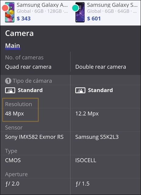기본 카메라를 살펴보면 갤럭시 A51에는 4800만 화소가 들어있죠. 갤럭시 S9+의 1200만 화소와는 큰 차이를 보입니다.