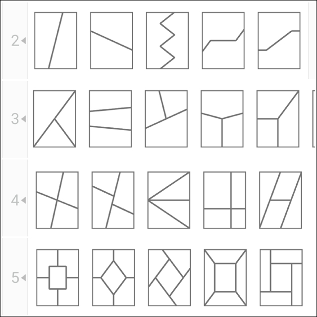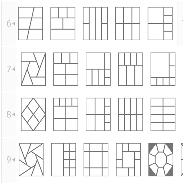 기본적인 형태로 가로 세로 격자 무늬의 콜라주 탬플릿뿐만 아니라, 대각선, 다이아몬드, 지그재그 등 다양한 형태의 탬플릿이 많이 있습니다.