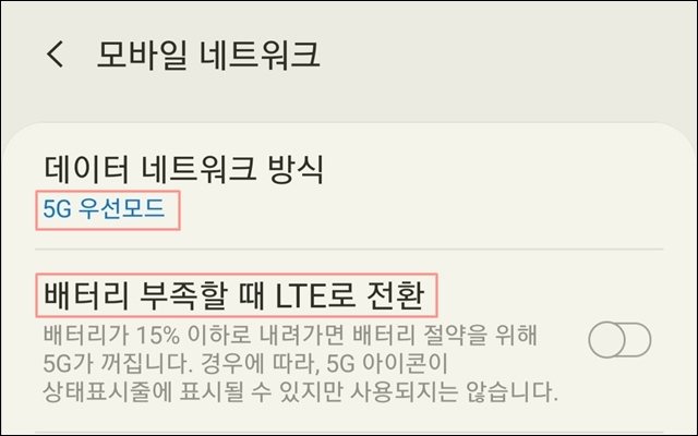 그리고 아래부분에는 배터리가 부족할 때 LTE로 전환할 수 있도록 추가 메뉴가 있죠. 설명을 읽어보면 5G가 배터리를 소모하고 있음을 알 수 있습니다. 빠른 통신 성능을 가진 만큼 그만큼 배터리 소모나 통신 안테나와의 접속에 배터를 조금 더 필요로 하는 것이죠.