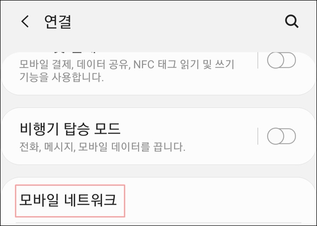 "연결" 메뉴에서 아래와 같이 "모바일 네트워크"로 되어있는 부분을 찾아서 들어가 봅니다.
