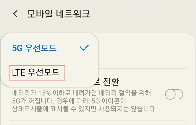 그래서 아래와 같이 "5G 우선모드"라고 되어 있는 부분을 선택하여 LTE 우선 모드 메뉴를 선택해 줍니다.