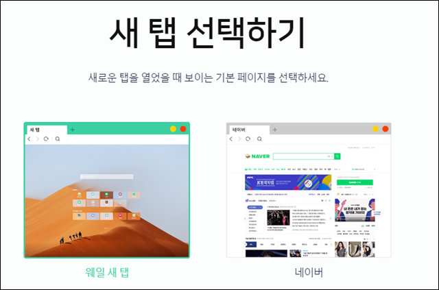 그래서 위와 같이 새 탭을 추가했을 때 어떤 화면을 보이게 하고 싶으냐는 것인데, 웨일의 기본 새탭 모양을 보이게 할 수도 있고, 오른쪽과 같이 네이버 홈페이지가 보이게 할 수도 있습니다.