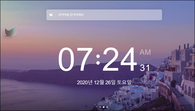 저는 위와 같이 기본적인 웨일 기본 탭 형식을 선택하였더니 위와 같은 화면 형태를 보여주고 있네요. 위와 같이 시계 및 날짜를 간단히 보여주고, 위쪽에는 네이버 검색창이 간략히 나타나 있습니다.
