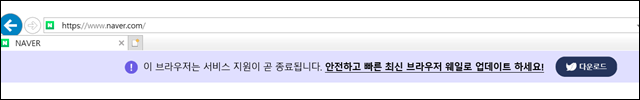 그런데 아래와 같이 네이버에 접속할 때마다 웨일 브라우저로 업데이트하라고 계속 뜹니다.