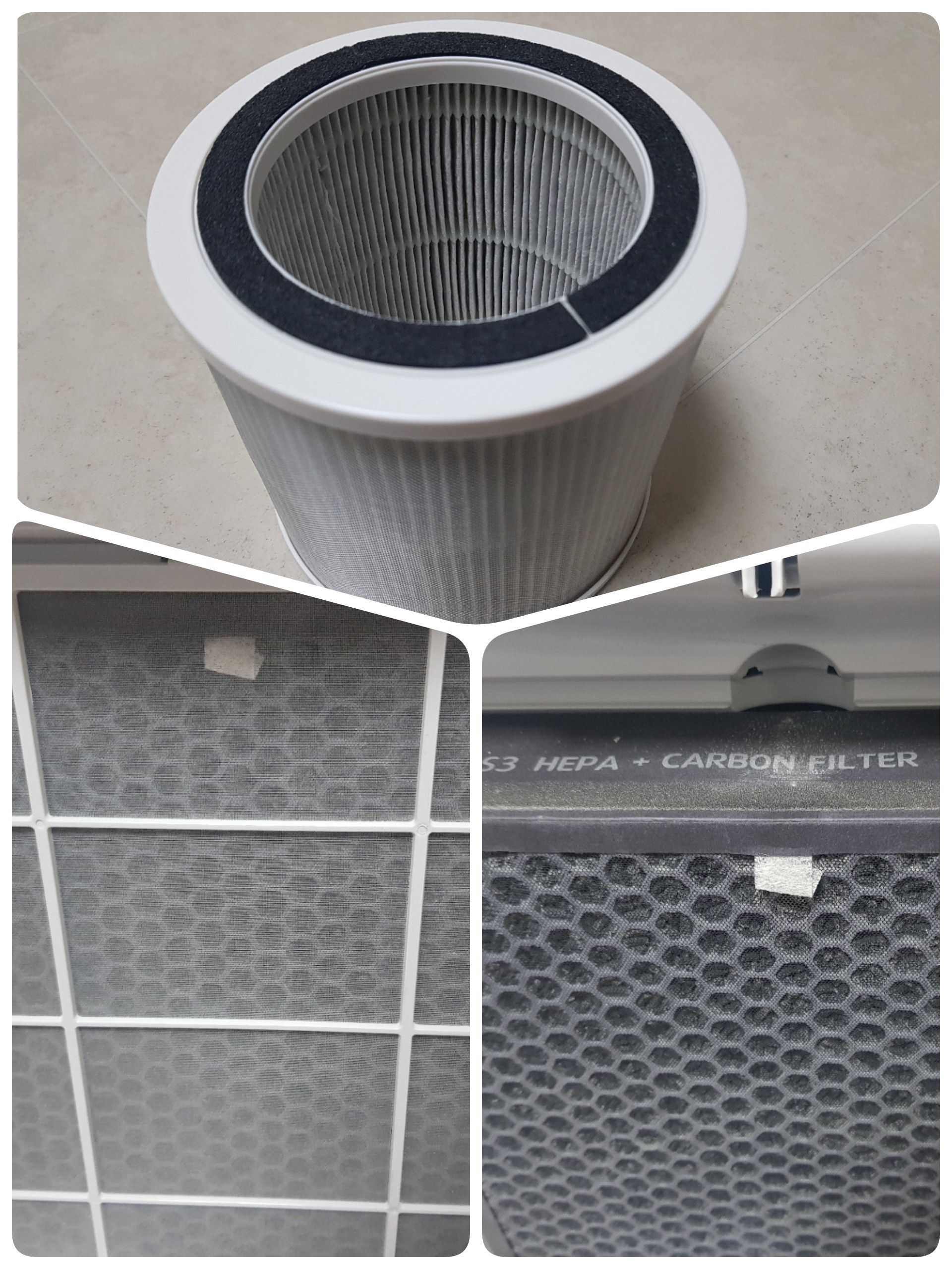 아래에 있는 첫 번째 사진처럼 소형의 미니 공기청정기(약 5평형) 급은 먼지망과 내부 메인 필터가 일체형으로 되어 있는 경우가 많습니다. 공기 정화 필터는 H12~H13등 다양하니 가능한 한 공기정화 능력이 좋은 H13필터를 가진 공기청정기를 구비하는 게 좋겠습니다.