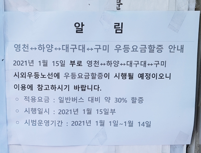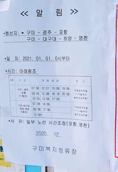 작은 터미널이다 보니 코로나 등 여파로 버스 시간대가 점점 줄다가 2020년 12월에는 정류장이 사라진다고 공지되었었죠.
