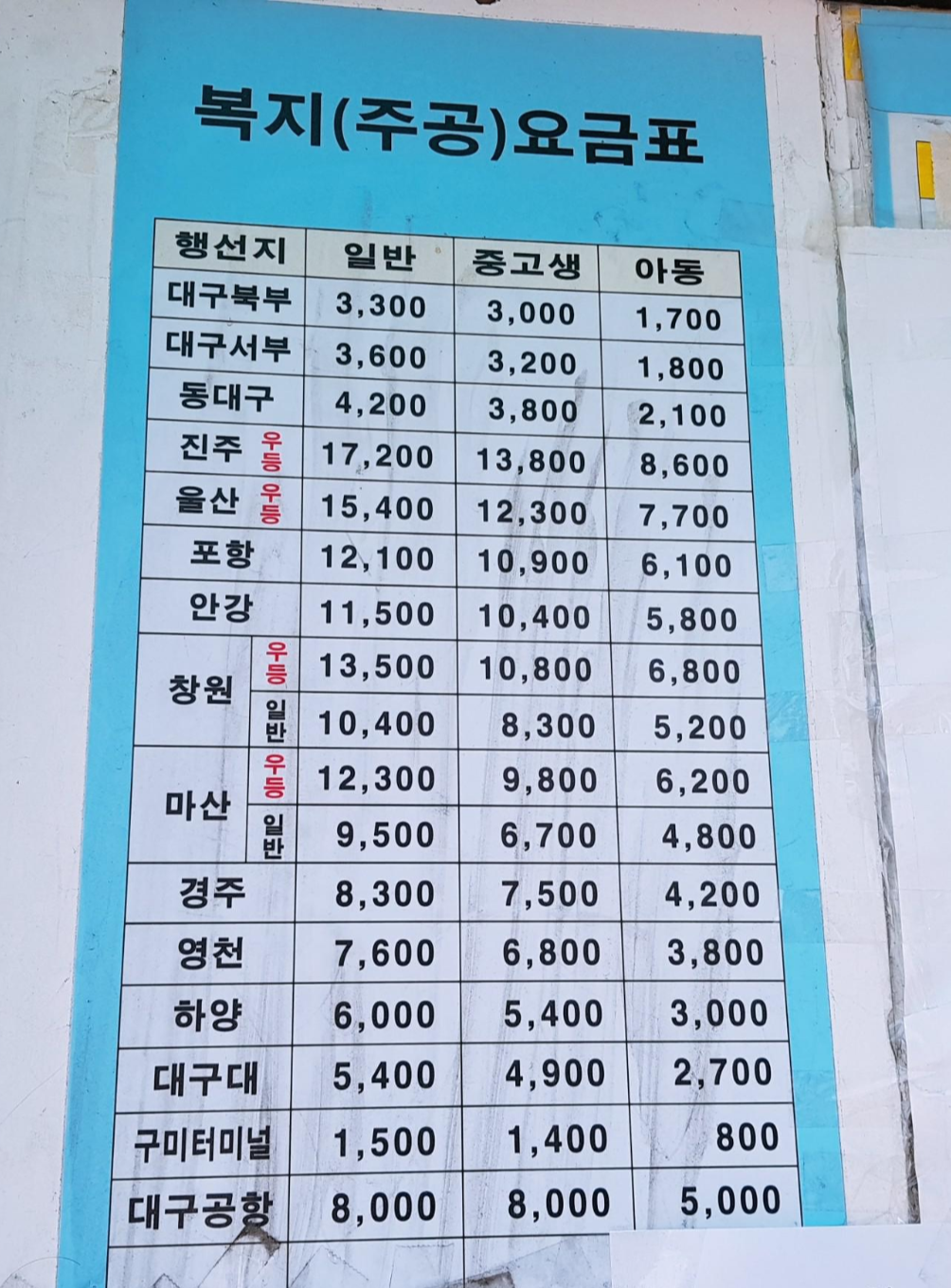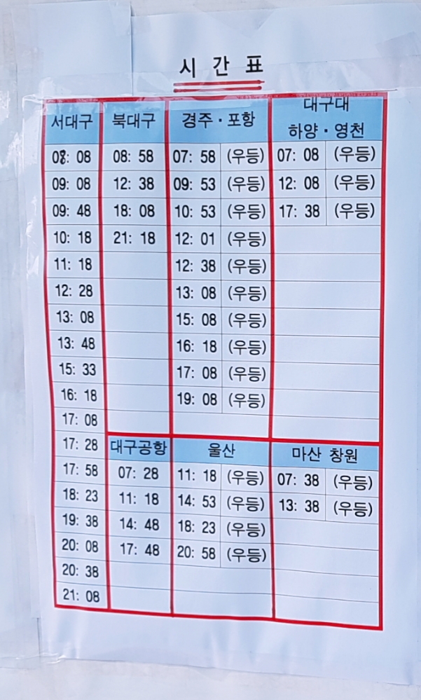 대구 노선을 보면 기존에 서대구, 북대구, 동대구로 가는 시외버스가 있었는데 여기 보니 동대구 시간표가 안보입니다.
