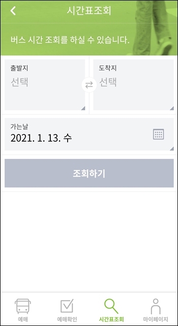 아래에 있는 메뉴 중 "시간표 조회"를 눌러 출발지와 도착지를 선택 후 날짜를 고르면 그 날짜에 있는 버스 시간표를 모두 확인할 수가 있습니다.