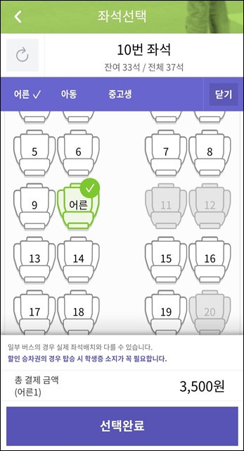 버스 시간을 선택했다면 아래와 같은 화면을 보실 수 있습니다. 좌석을 선택할 수 있다는 것이 아주 편리했습니다. 마치 영화관에서 자리를 선택하는 것처럼 버스 좌석을 원하는 대로 고를 수 있었죠.