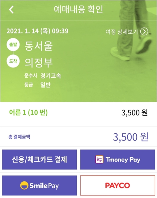 좌석 선택까지 완료하였다면 예매 내용을 확인한 후 결재를 진행해주면 됩니다. 아래와 같이 신용카드, 스마일 페이, 티머니, 페이코가 되니 선택해서 결제하면 되겠습니다.